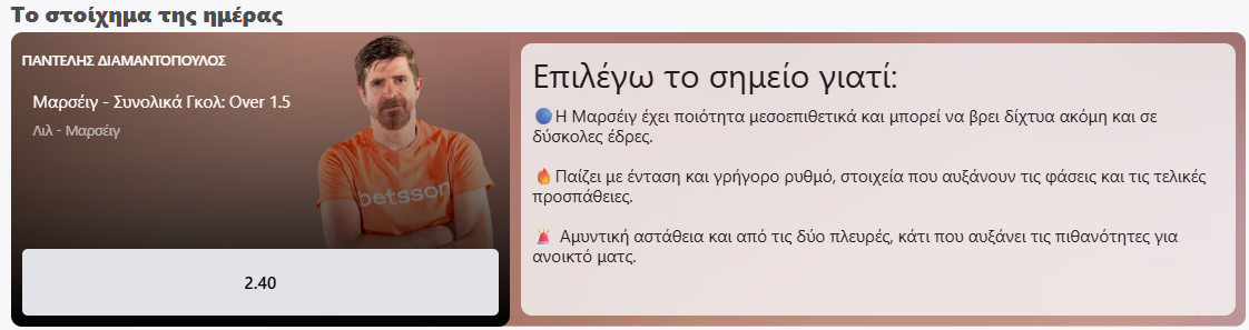 Ψάχνεις ακόμα το καλύτερο σημείο της ημέρας; Τώρα η Betsson κάνει τα πράγματα πιο απλά. Κάθε μέρα, ο Παντελής Διαμαντόπουλος διαλέγει για σένα το «Στοίχημα της ημέρας» για να έχεις πάντα μια ιδέα… από έμπειρο χέρι.